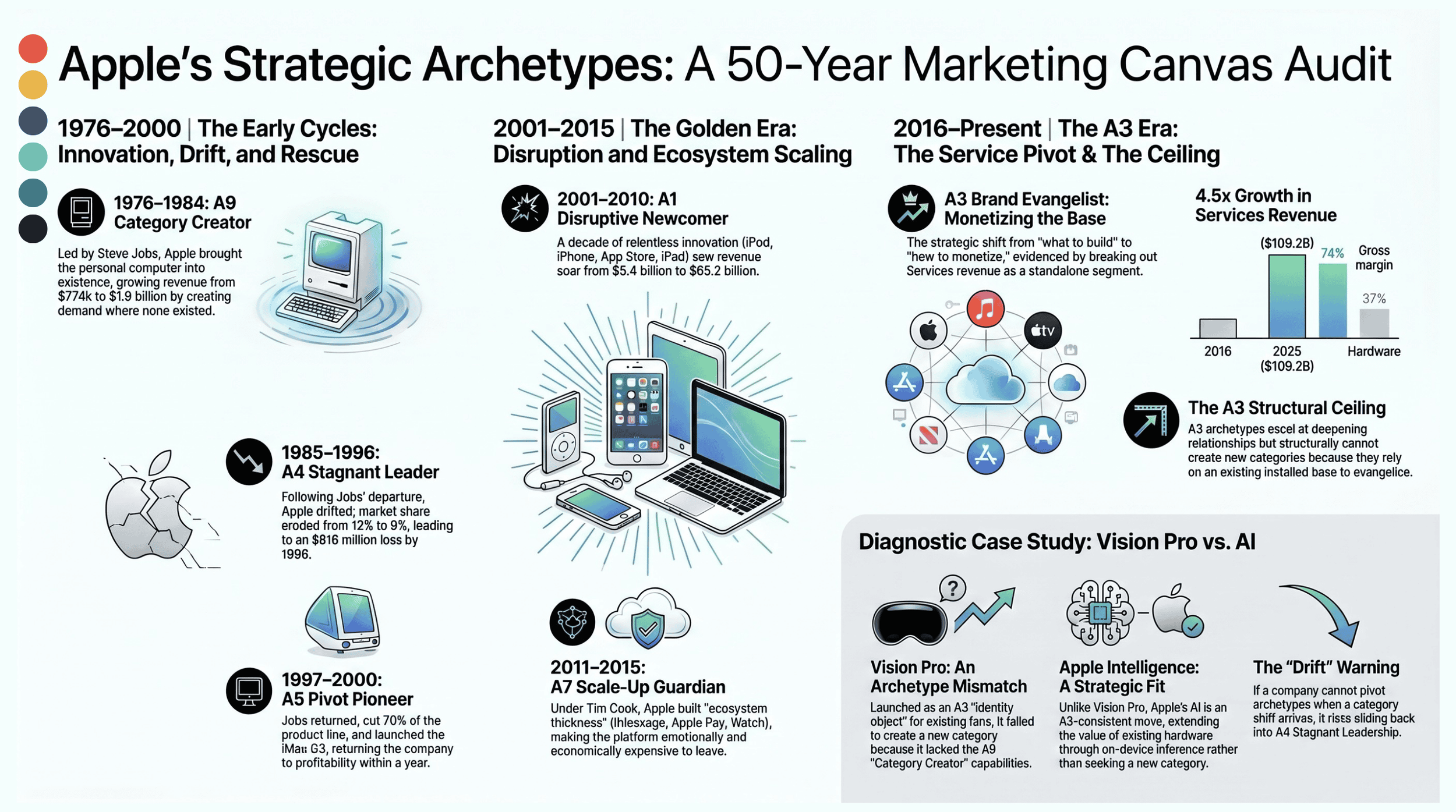 Laurent Bouty is the author of the Marketing Canvas Method. The full case study and methodology documents referenced here are available in the MCM case library. A comprehensive six-phase analysis of Apple's archetype evolution from 1976 to the present, with primary-source scoring for each phase under contemporaneous information horizons, is available on request.